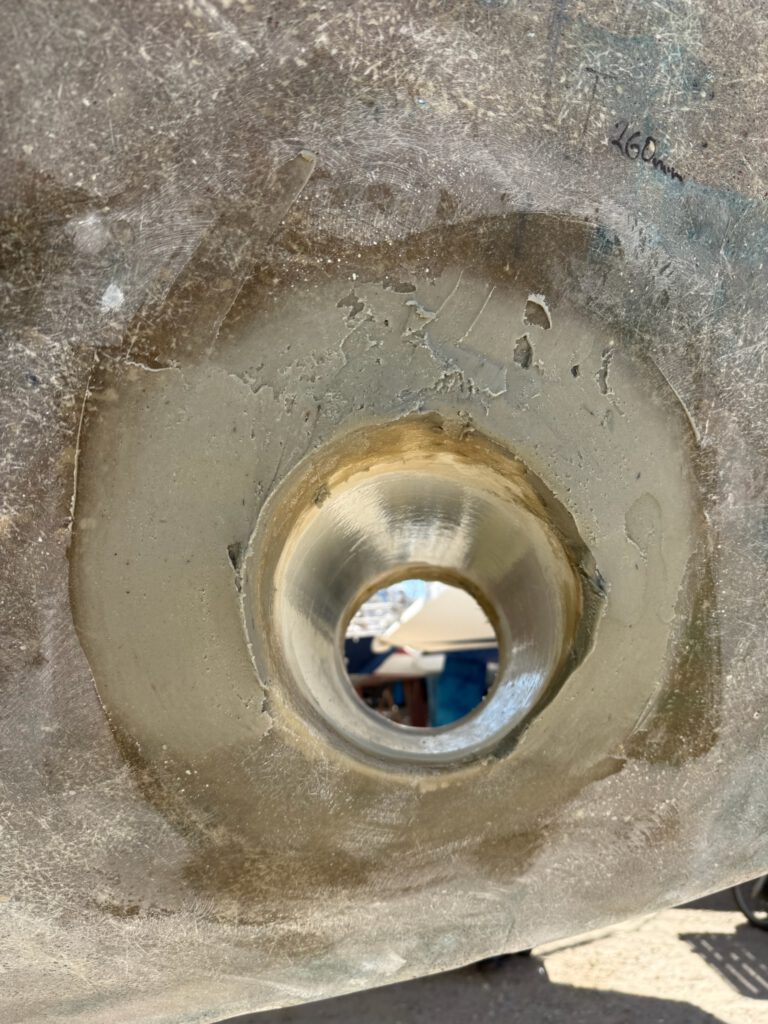 • Die alten BorddurchlĂ€sse wurden entfernt. Alex hat aus Epoxid die sogenannten „Donuts“ gebaut – runde LaminatverstĂ€rkungen, die innen auflaminiert werden und fĂŒr eine sichere, plane Auflage der neuen Seeventile sorgen.